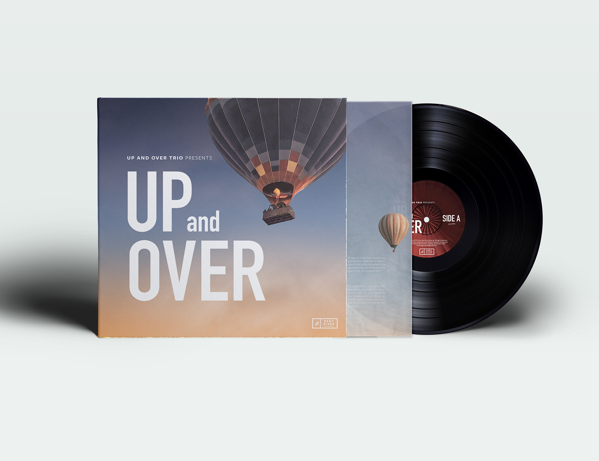 Throughout the package, images of hot air balloons drifting across a muted sunrise evoke a compelling sense of freedom and perseverance. The insert pictures balloons against a blue sky, so as the viewer opens the package, they are guided from the bright orange sunrise on the jacket cover to a soft morning glow that follows. The record’s centre labels bring the viewer to the cornerstone of their journey: when they look up during their ride through the clouds and the rising sun to behold the very thing controlling their rise and fall — a little flap at the top of the balloon that releases hot air. This little hole dictating rise and fall is controlled by a simple cord within the pilot’s grasp. On a journey through the hardships and challenges of life, everyone stands at the helm of their own ship with the power to fall down or rise up and over.