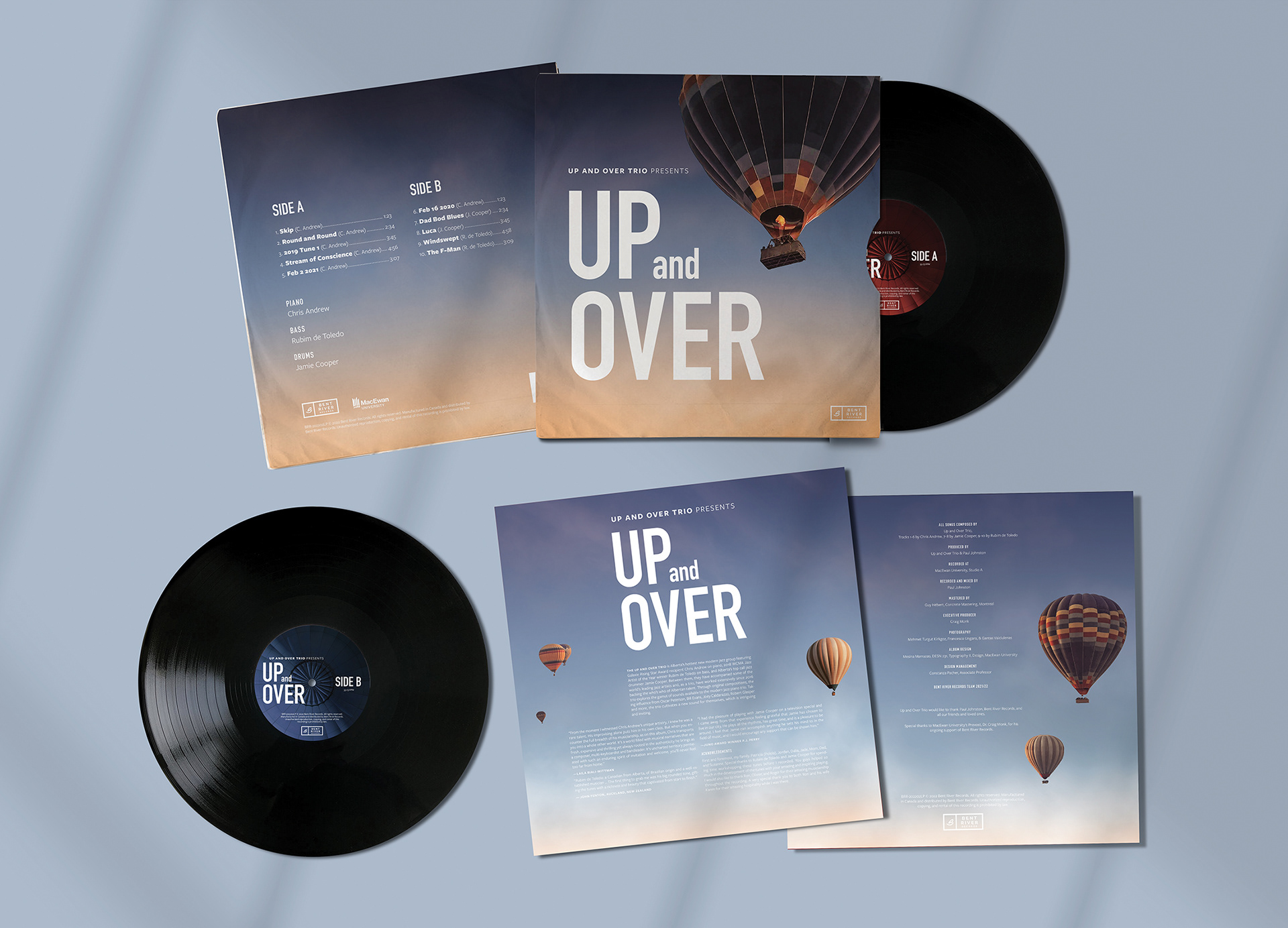 The name Up and Over has come to represent the Trio’s perseverance through the challenges of freelance work and side jobs, culminating in their first album. The hot air balloon is a vision of this perseverance and the act of rising “up and over” their hardships. It’s a symbol of strength and freedom. The sunrise indicates a new beginning, just as this album marks the start of the Trio’s musical journey together. A sunrise symbolizes mystery and what a new day might bring. It compels the viewer to think and wonder, just as the music of Up and Over desires to incite thoughtful introspection.